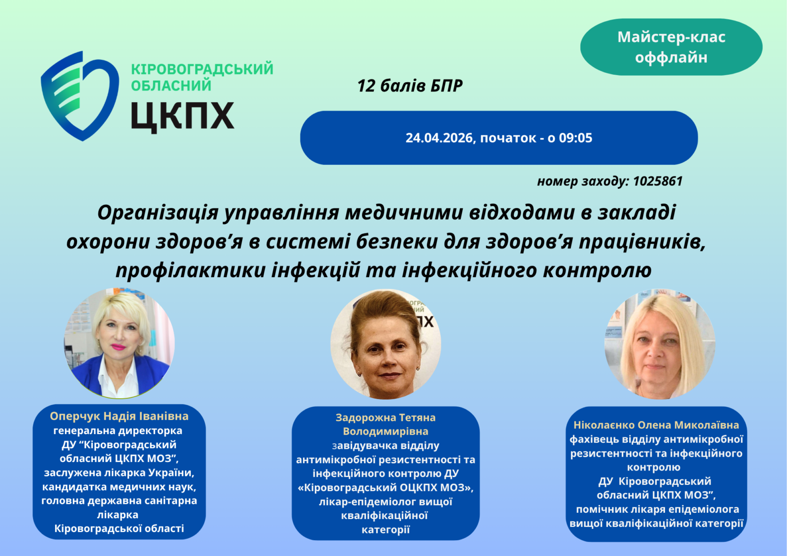 Майстер-клас на тему: 24.04.2026. Організація управління медичними відходами в закладі охорони здоров’я в системі безпеки для здоров’я працівників, профілактики інфекцій та інфекційного контролю (№ 1025861)