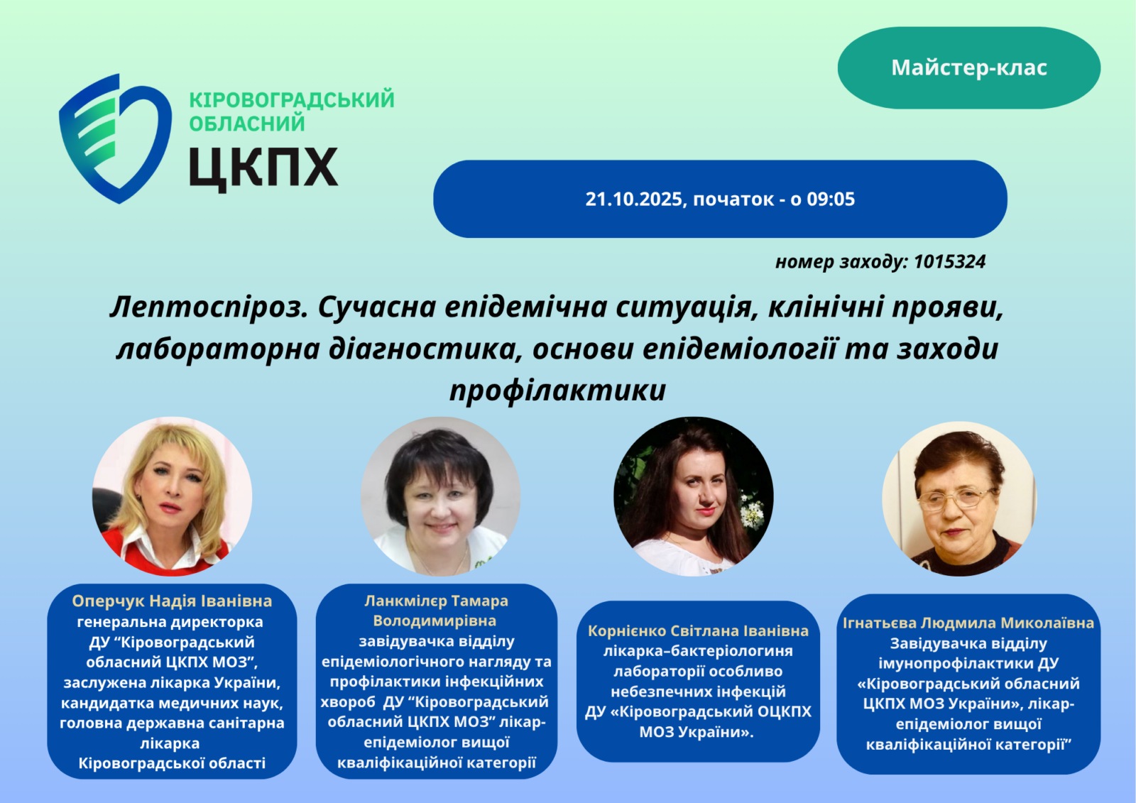 Майстер-клас на тему: Лептоспіроз. Сучасна епідемічна ситуація, клінічні прояви, лабораторна діагностика, основи епідеміології та заходи профілактики (№ 1015324)