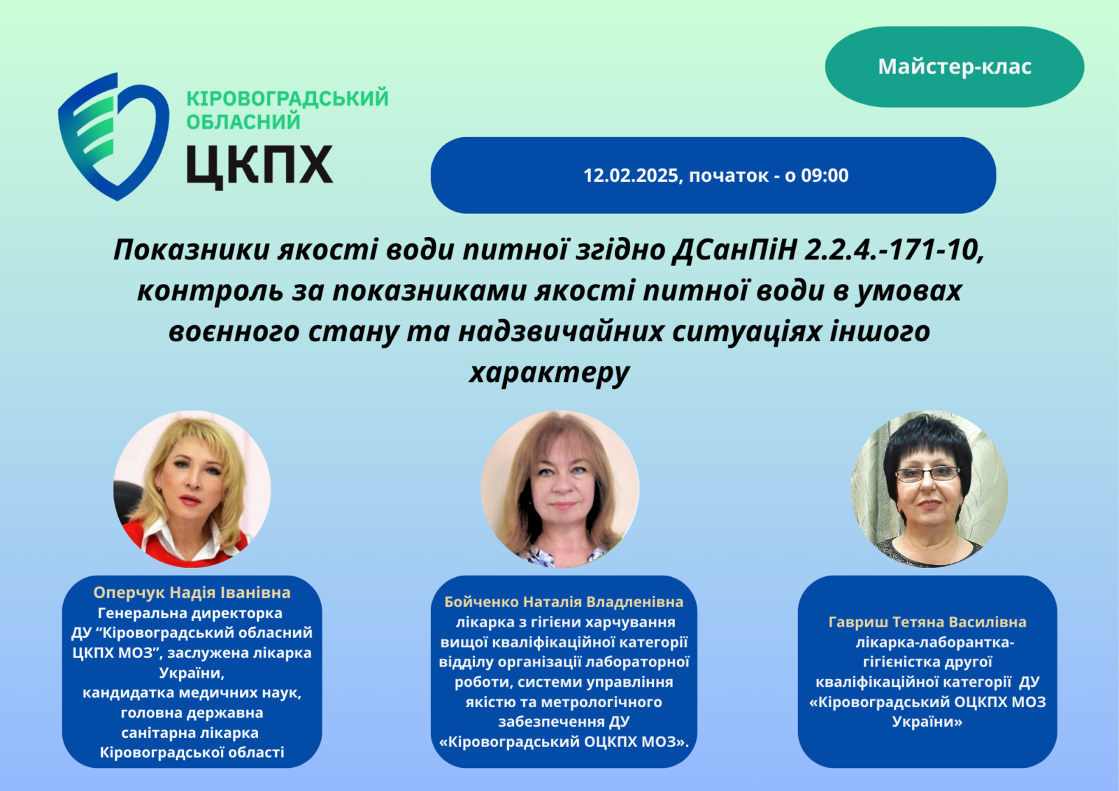 Майстер-клас на тему: Показники якості води питної згідно ДСанПіН 2.2.4.-171-10, контроль за показниками якості питної води в умовах воєнного стану та надзвичайних ситуаціях іншого характеру