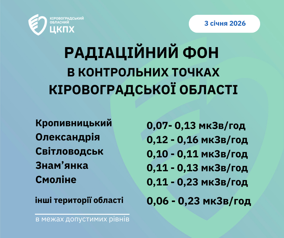 Станом на 08:30 сьогодні, 03.01.2026 р., показники радіаційного фону перебувають у межах допустимих рівнів.