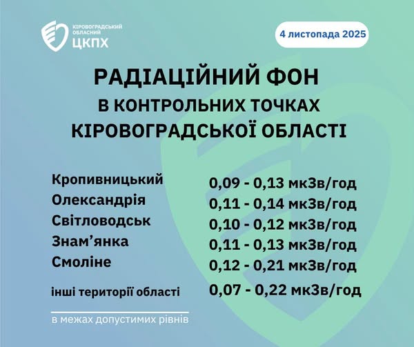 Радіаційний фон у місті Кропивницький та Кіровоградській області станом на 08:30 сьогодні, 04.11.2025