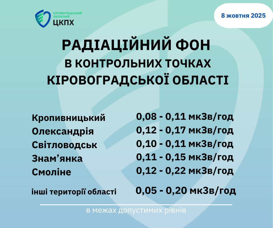 Радіаційний фон у місті Кропивницький та Кіровоградській області станом на 08:30 сьогодні, 08.10.2025