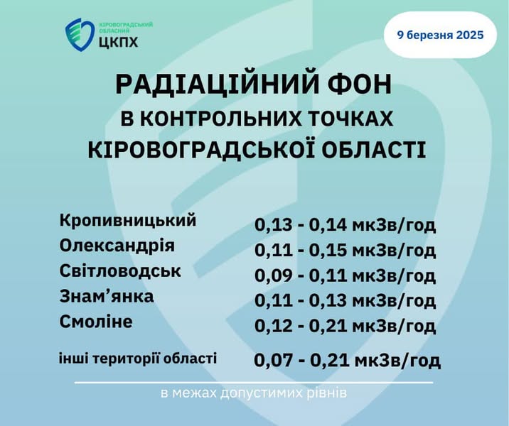 Радіаційний фон у місті Кропивницький та Кіровоградській області станом на 08:30 сьогодні, 09.03.2025