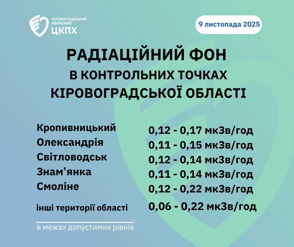 Радіаційний фон у місті Кропивницький та Кіровоградській області станом на 08:30 сьогодні, 09.11.2025