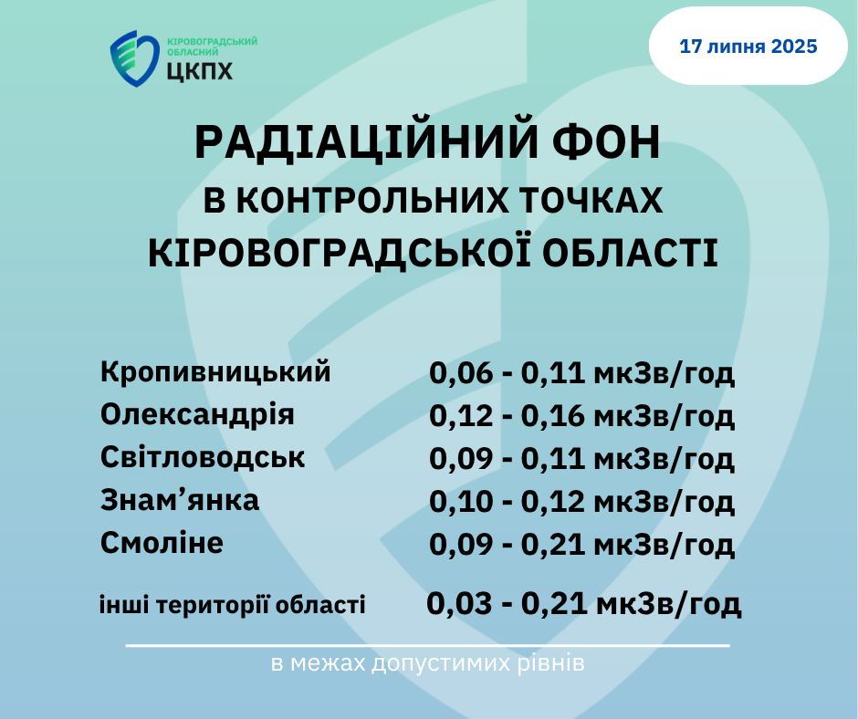 Станом на 08:30 сьогодні, 17.07.2025 р., показники радіаційного фону знаходяться в межах допустимих рівнів.