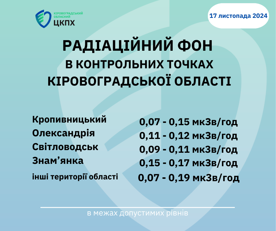 Станом на 08:30 сьогодні, 17.11.2024 р., показники радіаційного фону знаходяться в межах допустимих рівнів.