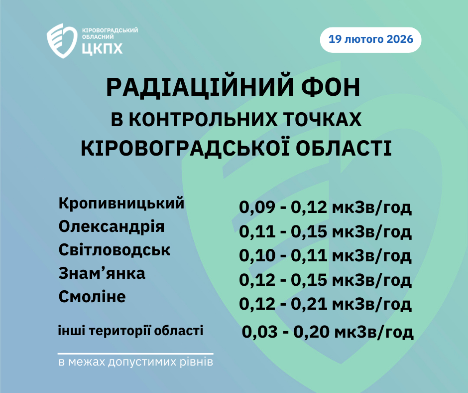 Радіаційний фон у місті Кропивницький та Кіровоградській області станом на 08:30 сьогодні, 19.02.2026