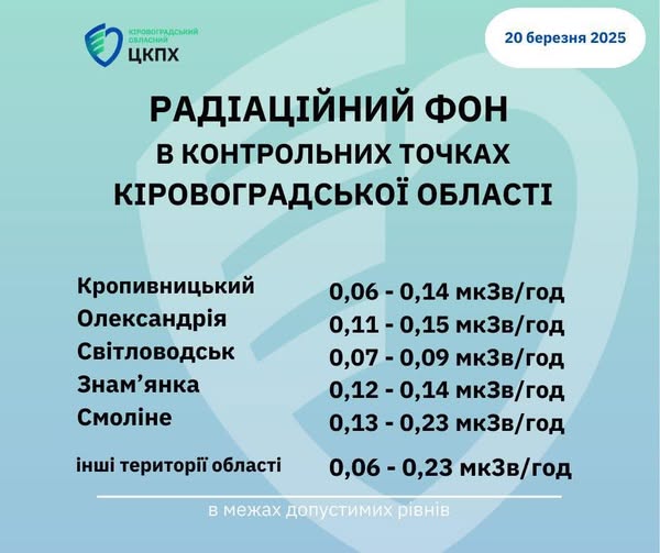 Радіаційний фон у місті Кропивницький та Кіровоградській області станом на 08:30 сьогодні, 20.03.2025