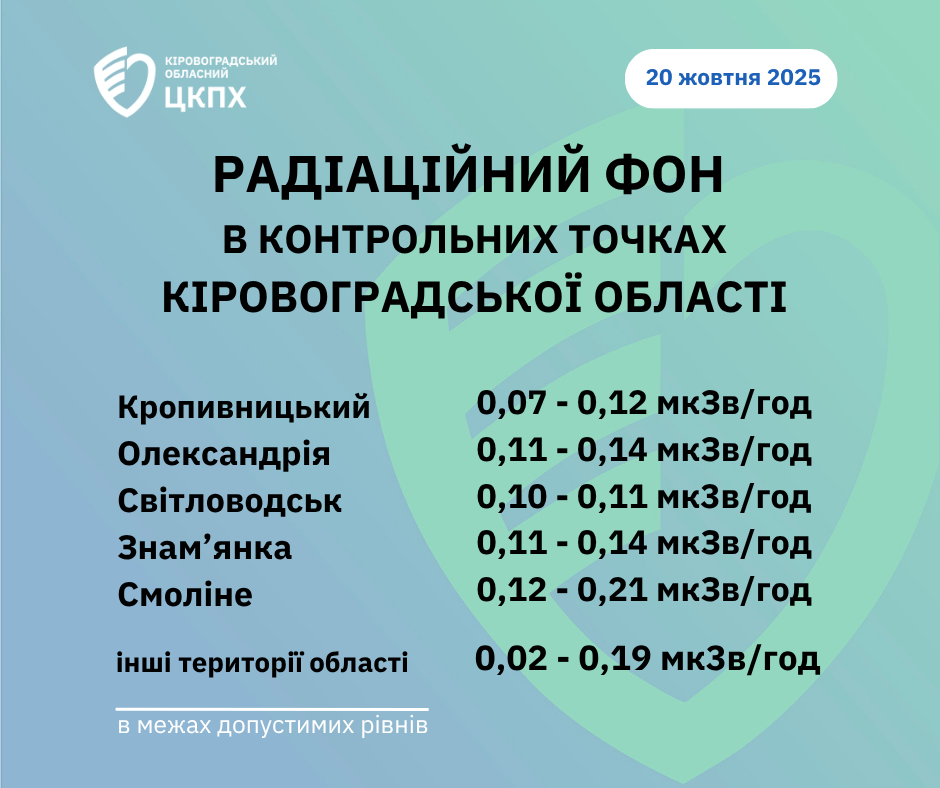 Станом на 08:30 сьогодні, 20.10.2025 р., показники радіаційного фону перебувають у межах допустимих рівнів.