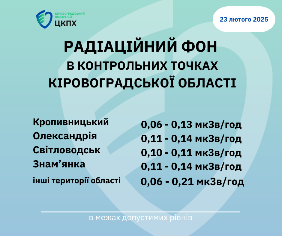 Радіаційний фон у місті Кропивницький та Кіровоградській області станом на 08:30 сьогодні, 23.02.2025
