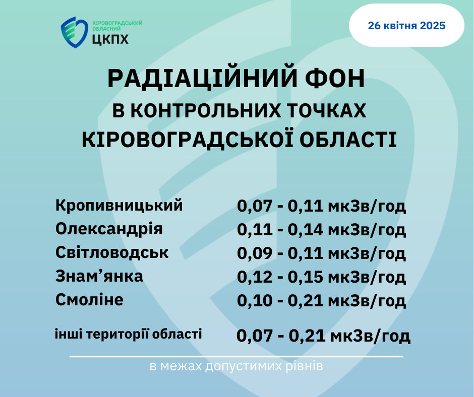 Радіаційний фон у місті Кропивницький та Кіровоградській області станом на 08:30 сьогодні, 26.04.2025
