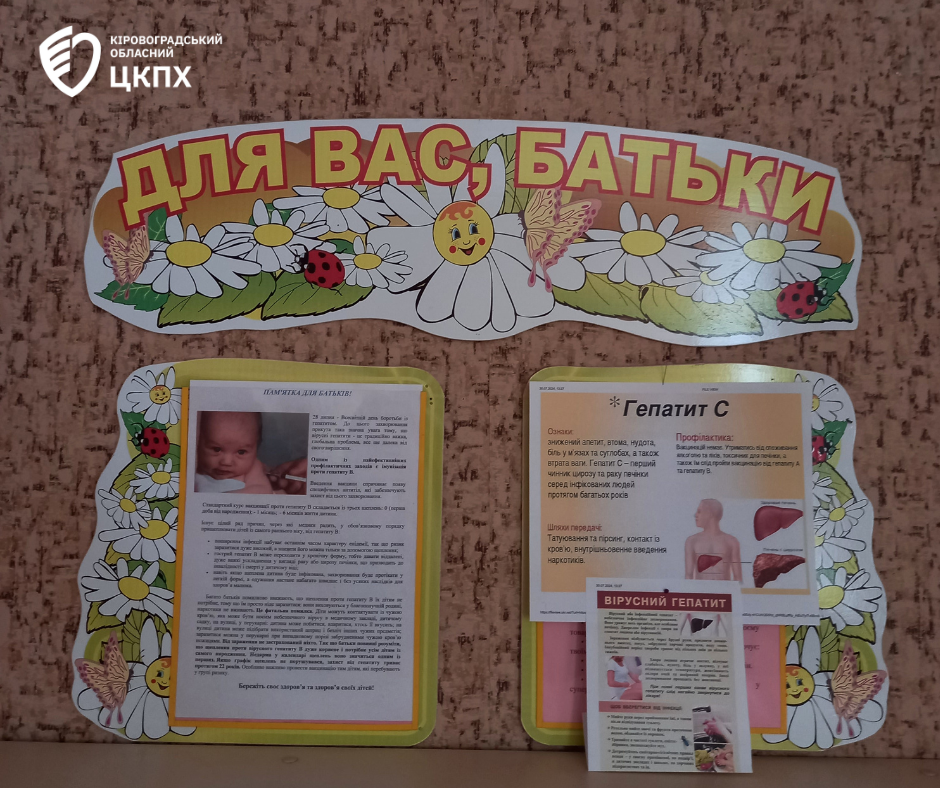 Фахівці розробили матеріали з профілактики гепатитів для розміщення на стендах навчальних закладів та в куточках для батьків закладів дошкільної освіти Новоархангельської, Підвисоцької, Надлацької та Вільшанської громад. Медичні працівнвики закладів використовують даний матеріал також для бесід з батьками вихованців.