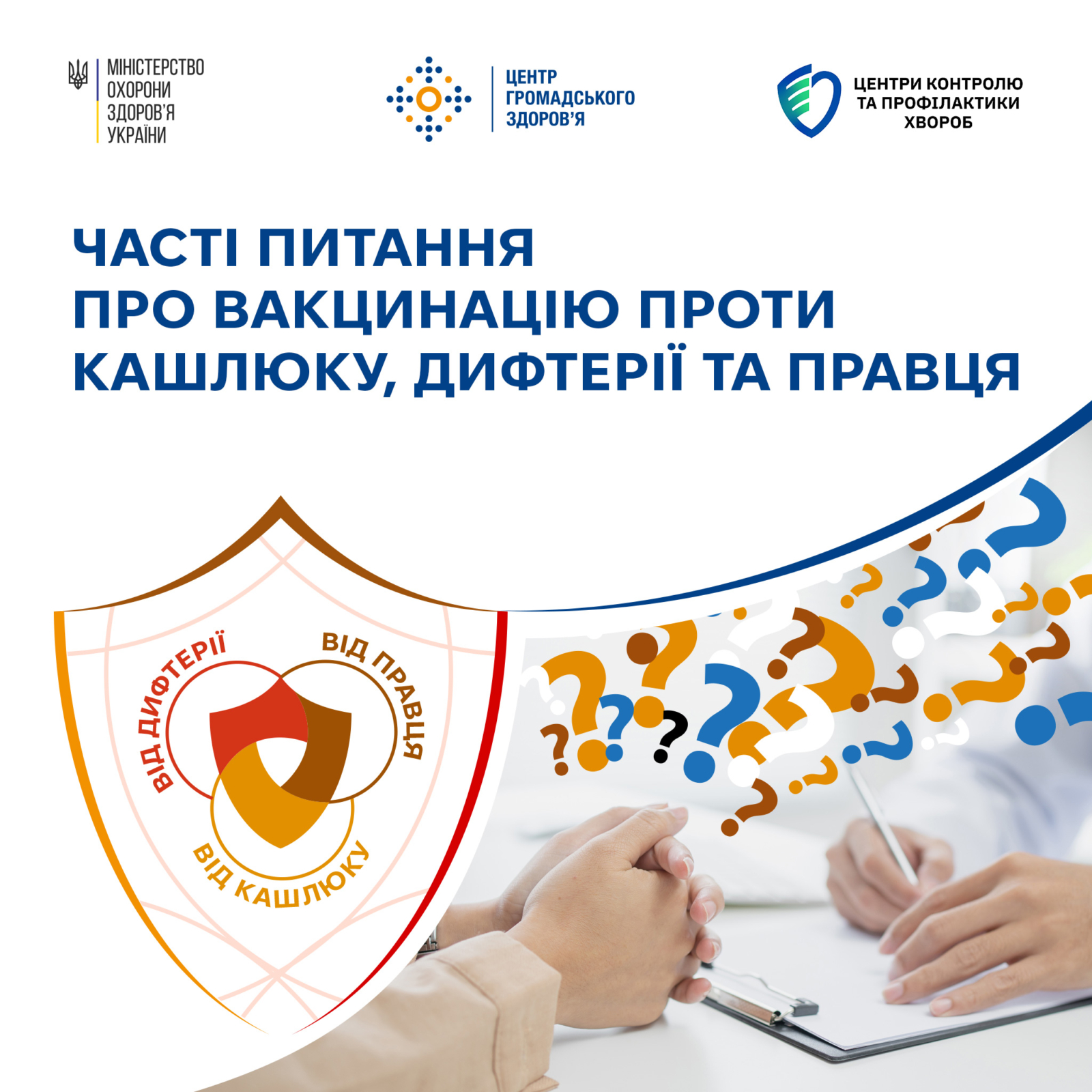 Експерти «Центру громадського здоров’я» відповідають на найпоширеніші питання про вакцинацію проти кашлюку, дифтерії та правця у рамках кампанії з додаткових заходів з імунізації проти цих хвороб для груп населення, які пропустили планові щеплення в попередні роки, та яким необхідно їх надолужити.