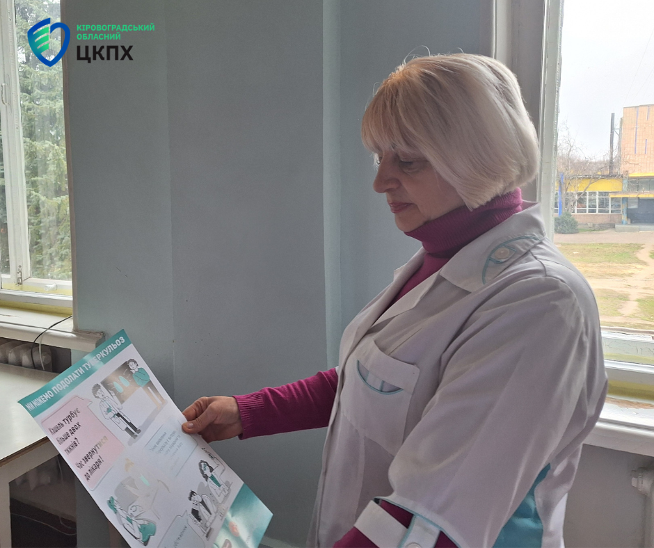 В рамках місячника протидії туберкульозу фахівчиня відділення епідеміологічного нагляду та профілактики інфекційних хвороб Гайворонського відділення Кіровоградського обласного центру контролю та профілактики хвороб Світлана Кольченко відвідала Гайворонську амбулаторію ЗПСМ КНП «ЦПМСД» Гайворонської міської ради.