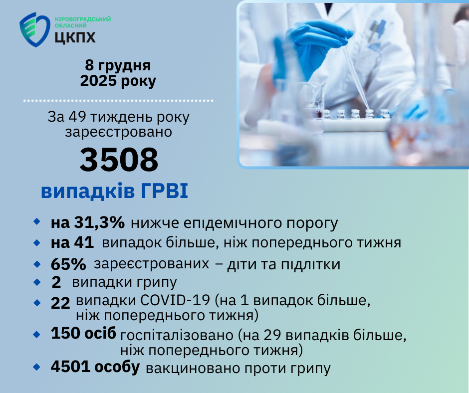3508 випадків ГРВІ – на 31,3 % нижче епідемічного порогу;