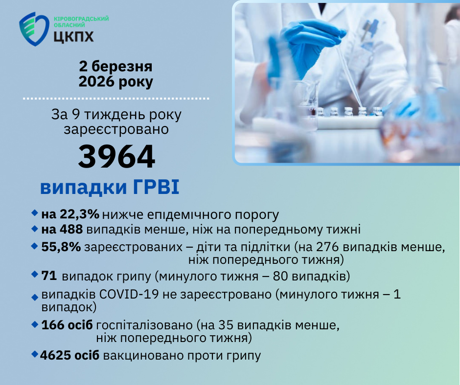 випадки ГРВІ 3964 – що на 22,3 % нижче епідемічного порогу;