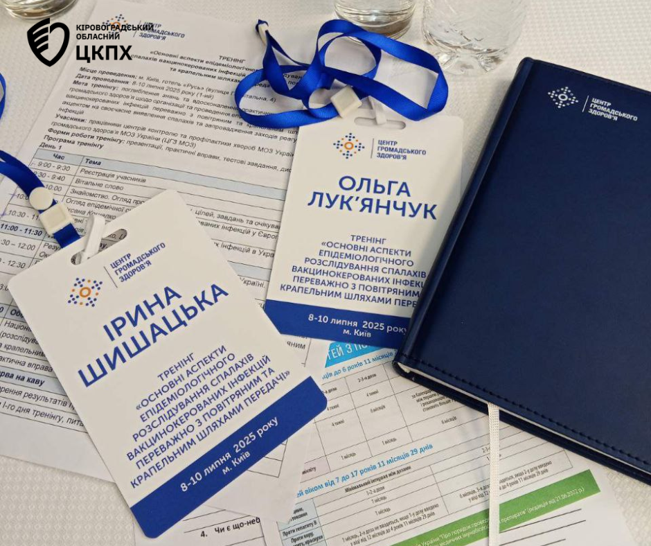 Професіоналка з громадського здоров’я відділу імунопрофілактики ДУ “Кіровоградський обласний центр контролю та профілактики хвороб МОЗ України” Ірина Шишацька та помічниця лікаря-епідеміолога Новоархангельського відділення Центру Ольга Лук’янчук взяли участь у офлайн-тренінгу для працівників центрів контролю та профілактики хвороб: «Основні аспекти епідеміологічного розслідування спалахів вакцинокерованих інфекцій переважно з повітряним та крапельним шляхами передачі», який організовано та проведено Центром громадського здоров’я МОЗ України 8-10 липня 2025 року у м. Київ.