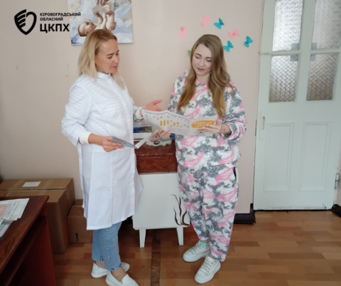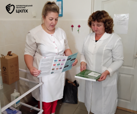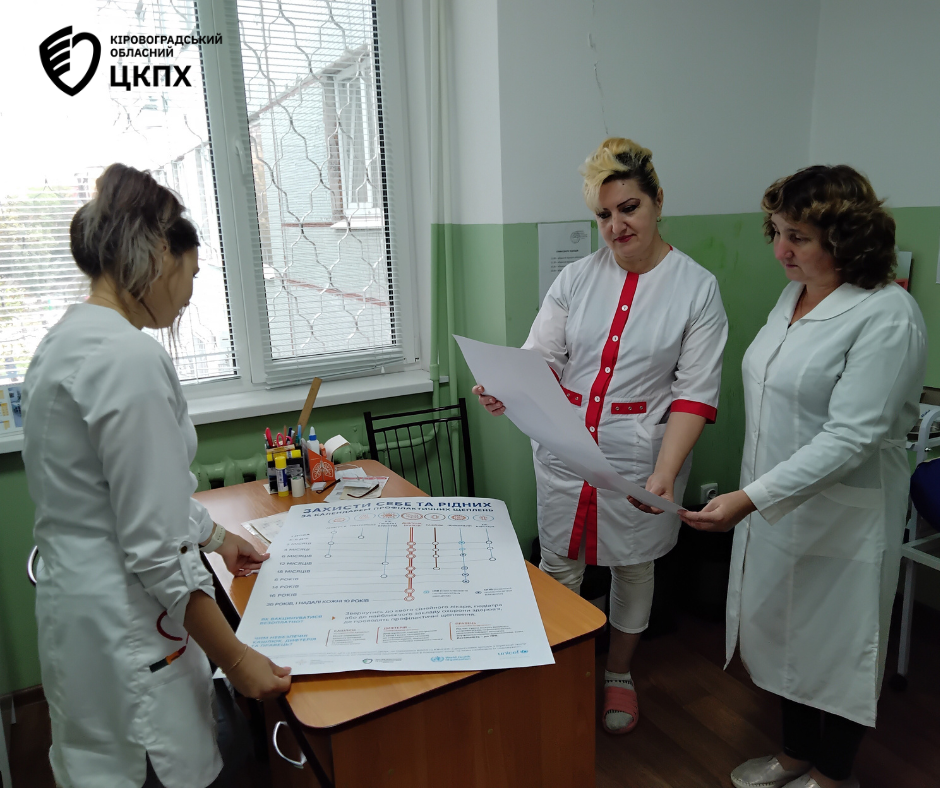 Розповсюдили друковані матеріали – плакати А1, А2 «Захисти себе та рідних за календарем профілактичних щеплень», лифлетів «Міфи про вакцинацію, факти проти страхів», «Вакцинація – вчасний захист» серед працівників закладів охорони здоров’я у КП «ЦПМСД м. Олександрії» ОМР, Амбулаторія №7, КП «ЦМЛ м. Олександрії» ОМР ( пологове відділення).