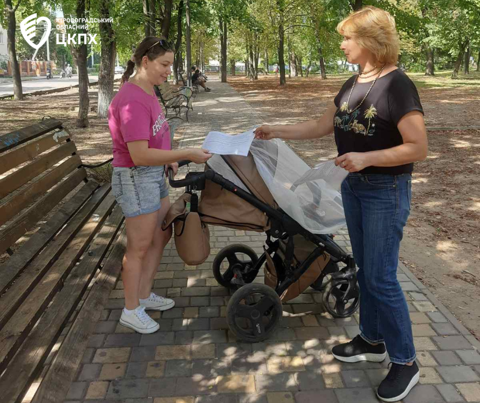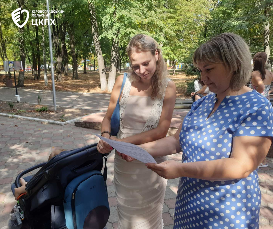 Фахівчині Центру Світлана Кольченко та Ірина Бігун в Парку Слави у Гайвороні в провели бесіди серед цільової аудиторії. Майбутнім мамам та породіллям роз’яснили, що грудне вигодовування – це скарб, особливо під час війни, коли є ризики, що дитячих сумішей може бракувати. Надали роз’яснення на запитання, в чому полягає різниця між грудним молоком та молозивом.