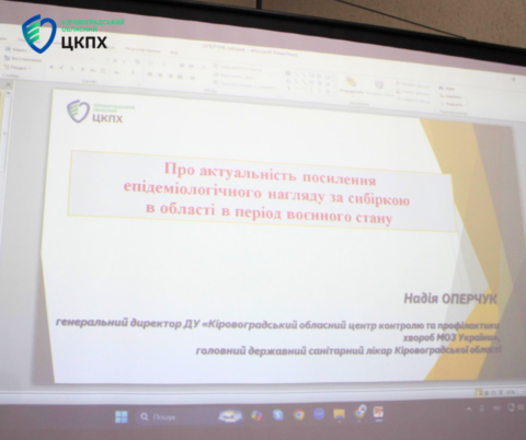 Головна державна санітарна лікарка області Надія Оперчук разом із завідувачкою відділу епідеміологічного нагляду та профілактки інфекційних хвороб Кіровоградського обласного центру контролю та профілактики хвороб Тамарою Ланкмілєр та лікаркою-бактеріологинею лабораторії особливо-небезпечних інфекцій Світланою Корнієнко організували та провели навчання щодо епіднагляду за сибіркою для фахівців епідпрофілю.