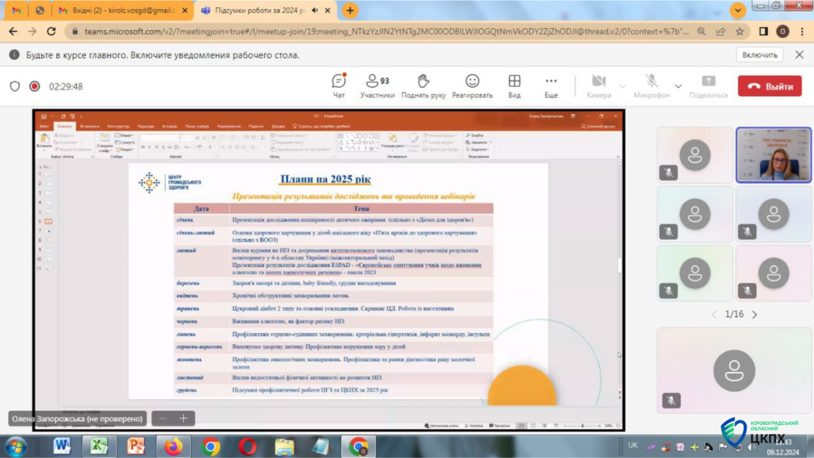 Фахівці відділу профілактики неінфекційних захворювань Кіровоградського обласного центру контролю та профілактики хвороб взялм участь у підсумковому вебінарі: «Підсумки роботи за 2024 рік та досвід ЦКПХ щодо профілактики НІЗ (використання розроблених друкованих та відео матеріалів) на регіональному рівні».