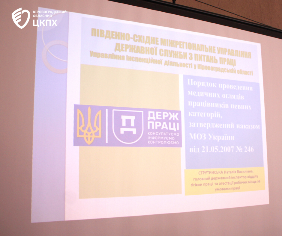 За ініціативи головної державної санітарної лікарки Кіровоградської області Надії Оперчук з працівниками державної установи «Кіровоградський обласний центр контролю та профілактики хвороб МОЗ України» зустрілася головна державна інспекторка відділу гігієни праці та атестації робочих місць за умовами праці управління інспекційної діяльності у Кіровоградській області Південно-Східного міжрегіонального управління Державної служби з питань праці Наталія Струтинська.