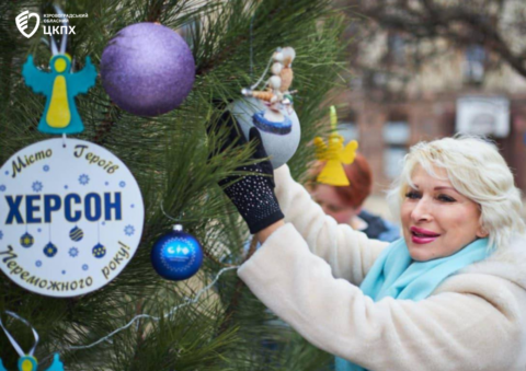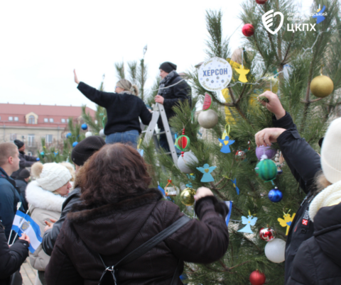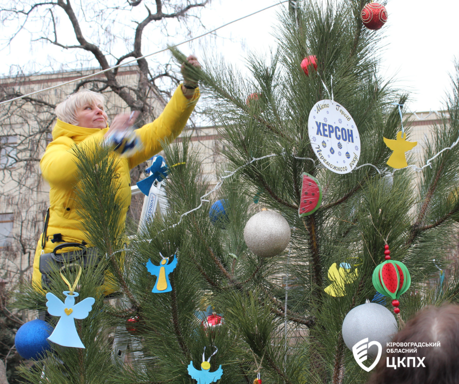 Деревця завішали жовто-блакитними кулями, фетровими ангеликами. На «херсонську» сосну начепили також символічні кавуни: Херсон – у наших серцях. Ми разом!