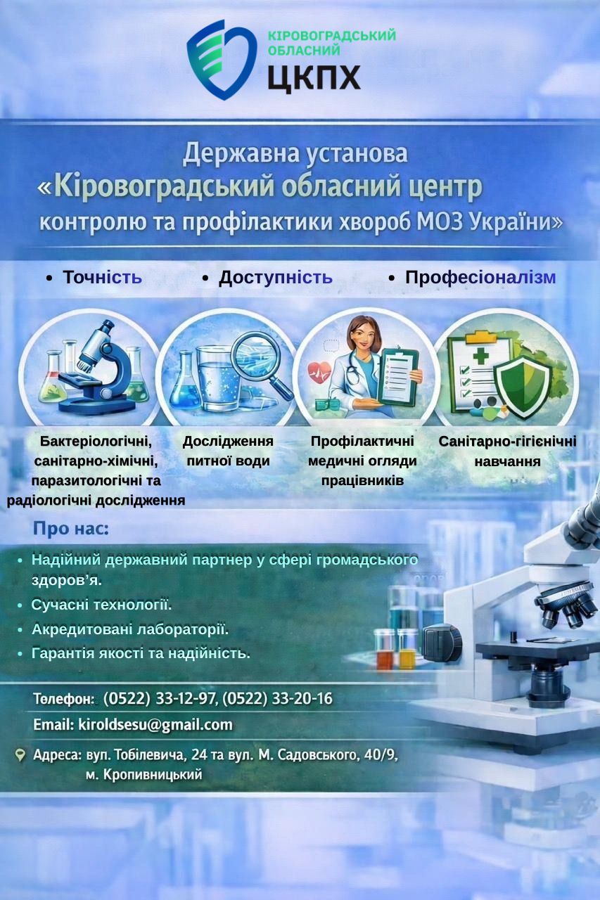 Державна установа «Кіровоградський обласний центр контролю та профілактики хвороб МОЗ України» проводить якісні та достовірні лабораторні дослідження для населення, підприємств та установ Кіровоградської області.