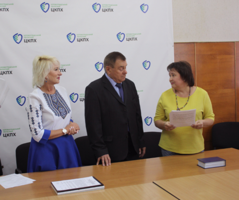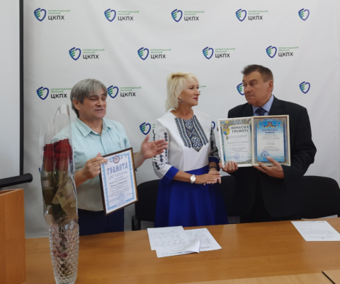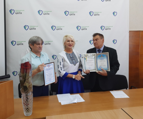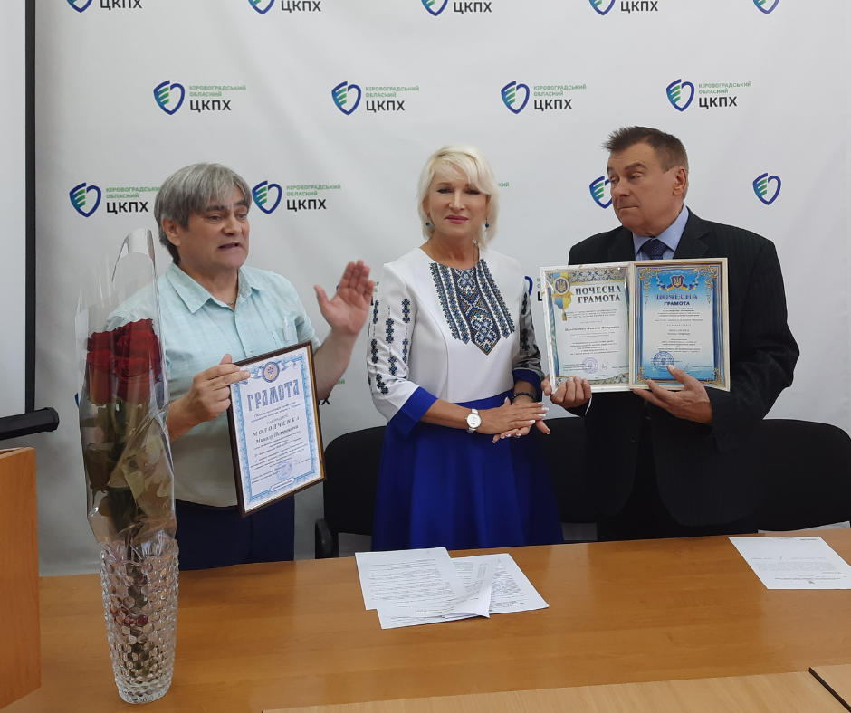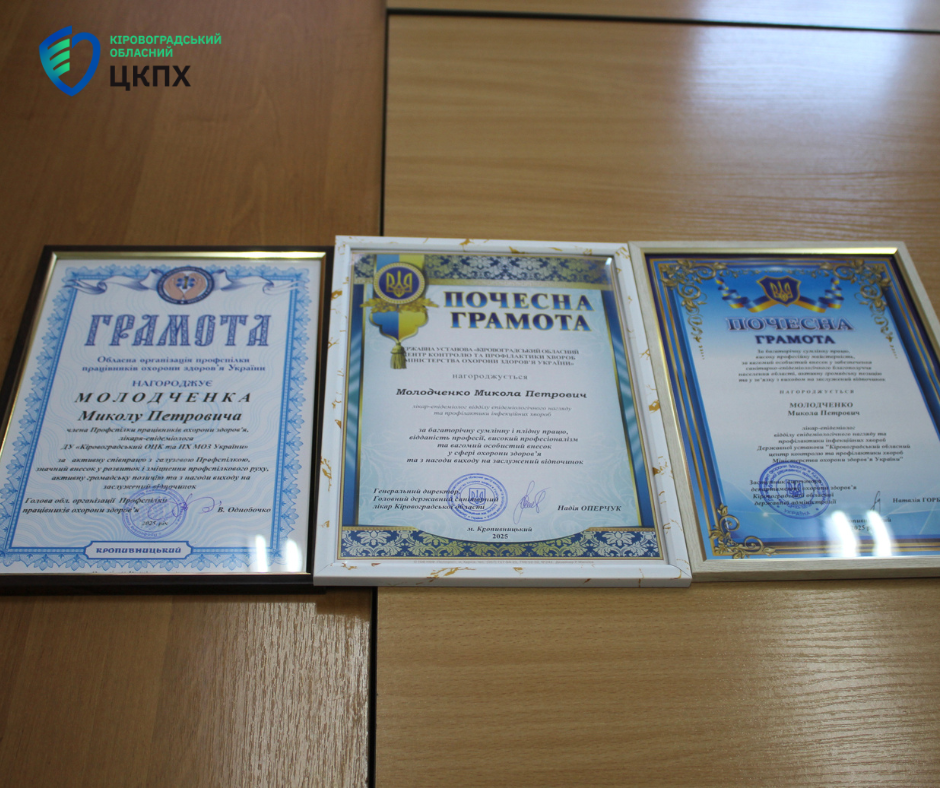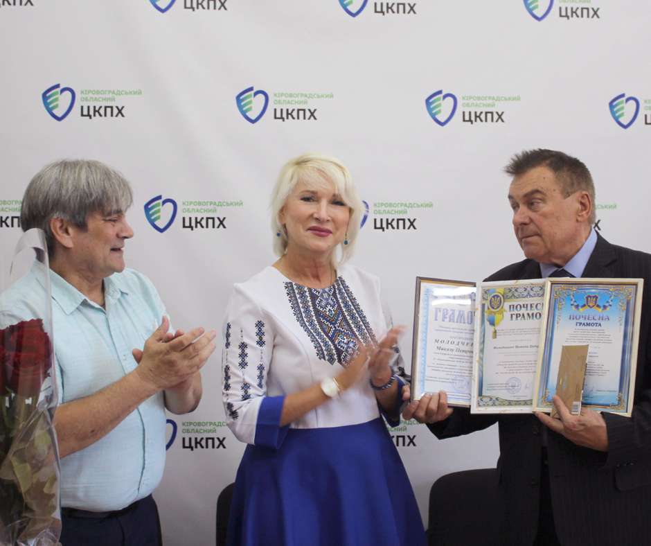 Від імені департаменту охорони здоров’я ОВА очільниця Центру вручила Миколі Молодченку Почесну грамоту. Почесно грамотою та премією відзначили іменинника й на рівні обласного центру контролю та профілактики хвороб та профспілкової організації.