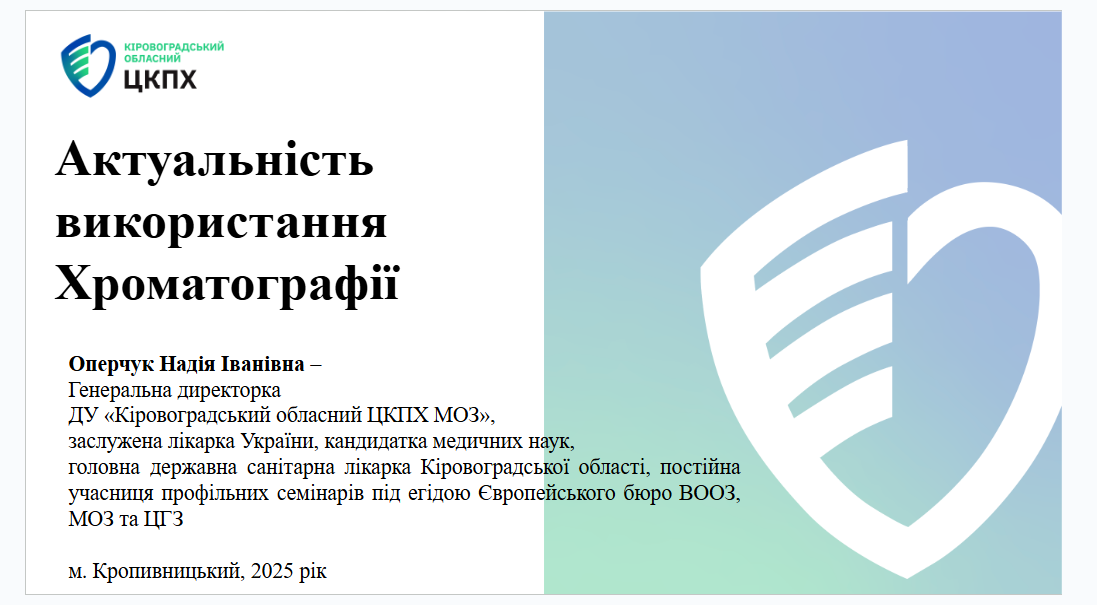 Головна державна санітарна лікарка Кіровоградської області, кандидат медичних наук Надія Оперчук разом із завідувачкою токсикологічної лабораторії ДУ «Кіровоградський обласний центр контролю та профілактики хвороб МОЗ України», лікаркою вищої кваліфікаційної категорії Оленою Романенко та лікаркою лаборанткою-гігієністкою токсикологічної лабораторії Оленою Колос провели майстерклас на тему: «Хроматографія. Основи методу».
