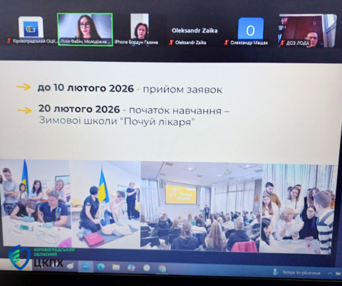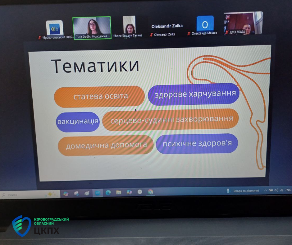 Головна державна санітарна лікарка області Надія Оперчук разом з фахівцями Кіровоградського обласного центру контролю та профілактики хвороб взяла участь в онлайн-зустрічі уповноважених представників молодіжної ради при МОЗ України, під час якої обговорили основні принципи роботи проєкту «Амбасадори здоров’я. Почуй лікаря».