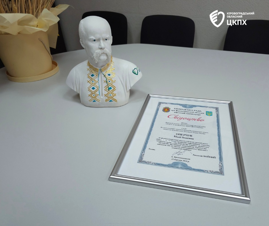 Вона також передала колективу вручене їй головою громадської ради при Кіровоградській ОВА Анатолієм Войним брендоване погруддя Тараса Шевченка «Великий будитель», яким відзначено роль ОЦКПХ у зміцненні суверенітету України та наближенні нашої країни до ідеалів демократичної, правової і соціальної держави.