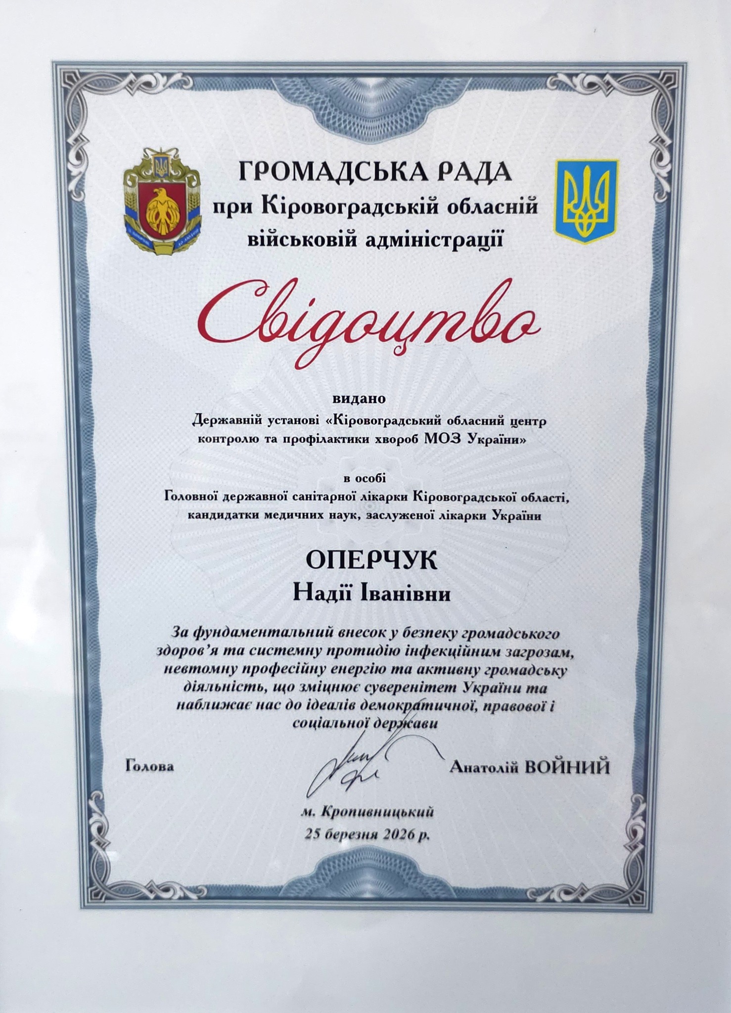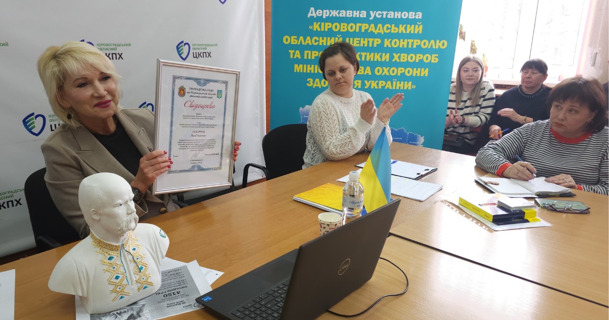 Директорка державної установи «Кіровоградський обласний центр контролю та профілактики хвороб МОЗ України» Надія Оперчук представила колективу відзнаку, отриману напередодні під час чергового засідання громадської ради при Кіровоградській обласній військовій адміністрації.