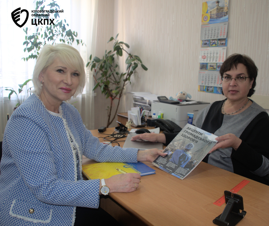Головна державна санітарна лікарка Кіровоградської області Надія Оперчук передала примірник журналу «Акценти громадського здоров’я» генеральному директору КНП «Кіровоградський обласний фтизіопульмолоногічний медичний центр КОР» Галині Горенко.