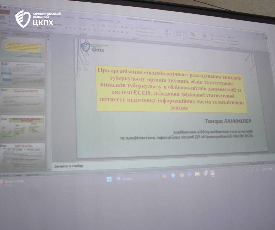 Завідувачка відділу епідеміологічного нагляду та профілактики інфекційних хвороб Кіровоградського обласного центру контролю та профілактики хвороб Тамара Ланкмілєр організувала та провела для фахівців Центру навчання «Про організацію епідеміологічного розслідування випадків туберкульозу органів дихання, облік та реєстрацію випадків туберкульозу в обліково- звітній документації та системі ЕСЕН, складання державної статистичної звітності, підготовку інформаційних листів та аналітичних довідок» в межах місяця подолання туберкульозу.