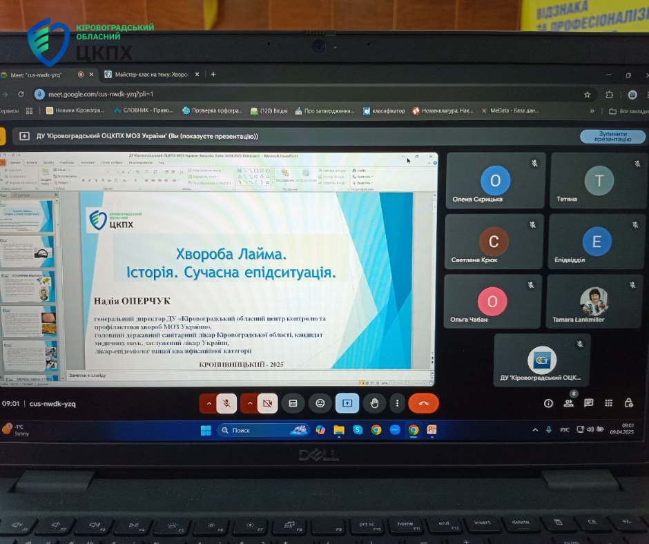 Головна державна санітарна лікарка Кіровоградської області Надія Оперчук, лікарка-епідеміологиня відділу епідеміологічного нагляду та профілактики інфекційних хвороб Кіровоградського обласного центру контролю та профілактики хвороб Аліна Дубина, ентомологиня паразитологічної лабораторії Тетяна Колодіна та вірусологиня вірусологічної лабораторії Катерина Таран організували та провели майстерклас з безперервного професійного розвитку на тему: «Хвороба Лайма. Сучасна епідситуація, клінічні прояви, діагностика, епідеміологія, ентомологічний моніторинг та профілактика».