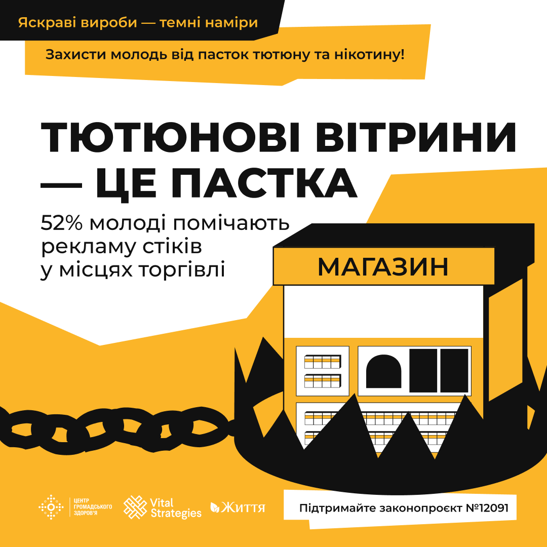 Проте тютюнова індустрія використовує вітрини у місцях торгівлі для агресивного залучення нових курців серед молоді. Щороку тютюнові компанії витрачають на це до 1,6 мдрд грн*.