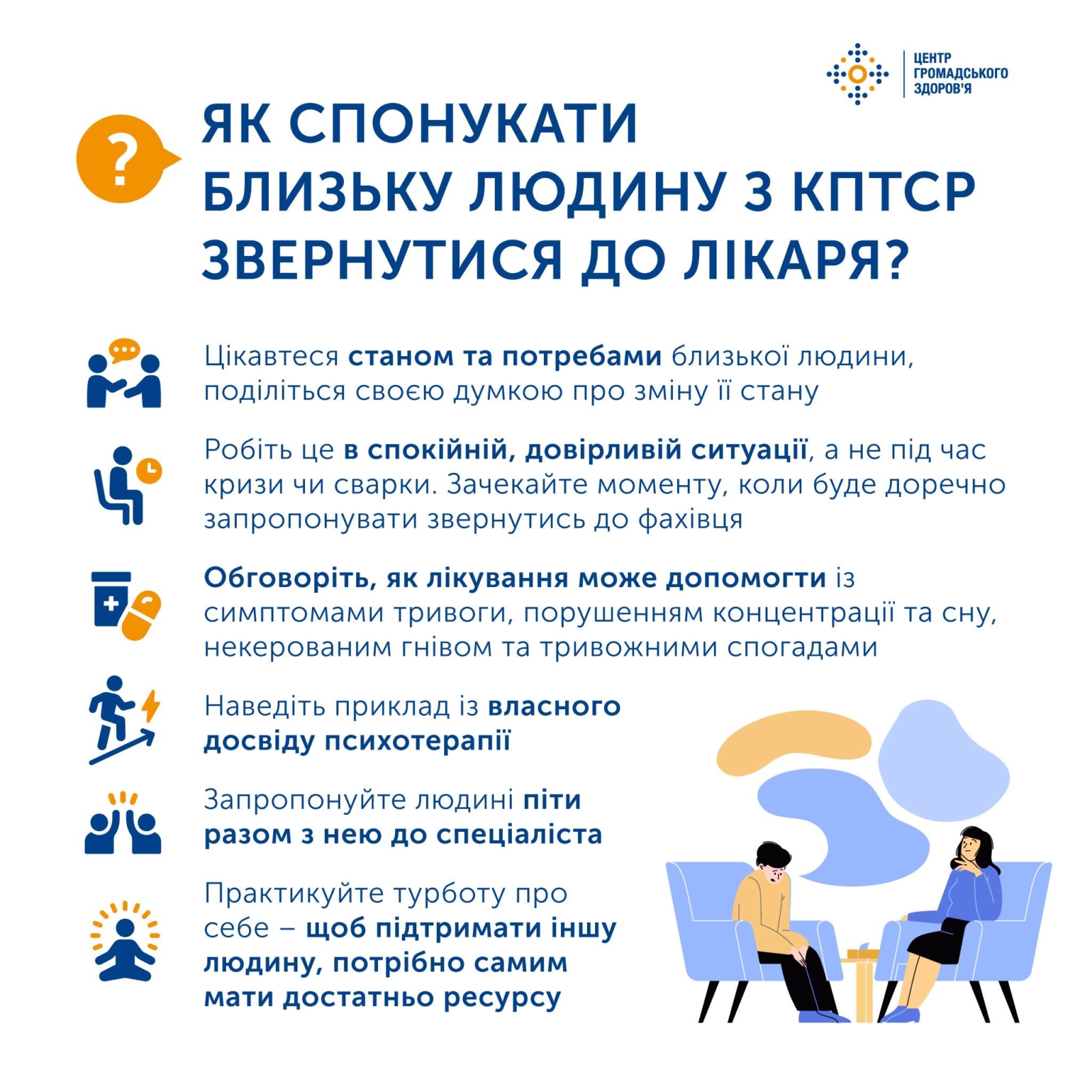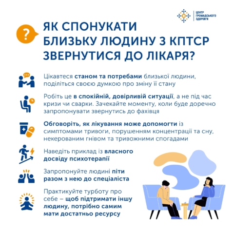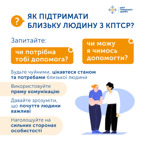 Якщо близька людина має ПТСР/КПТСР, то не змушуйте її звернутись по медичну допомогу. Замість некоректного «думаю, тобі краще звернутись по допомогу до психолога/психотерапевта/психіатра» краще поцікавтеся «чи потрібна тобі допомога?», «чи можу я чимось допомогти?». Важливо це робити в спокійній обстановці. Завжди чекайте доречного моменту, щоб запропонувати звернутись до фахівця.