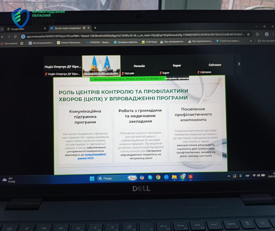 Генеральна директорка Кіровоградського обласного центру контролю та профілактики хвороб Надія Оперчук разом із фахівцями установи взяла участь в онлайн семінарі, під час якого обговорювали питання проведення інформаційної кампанії національної програми «Скринінг здоров’я 40 +».