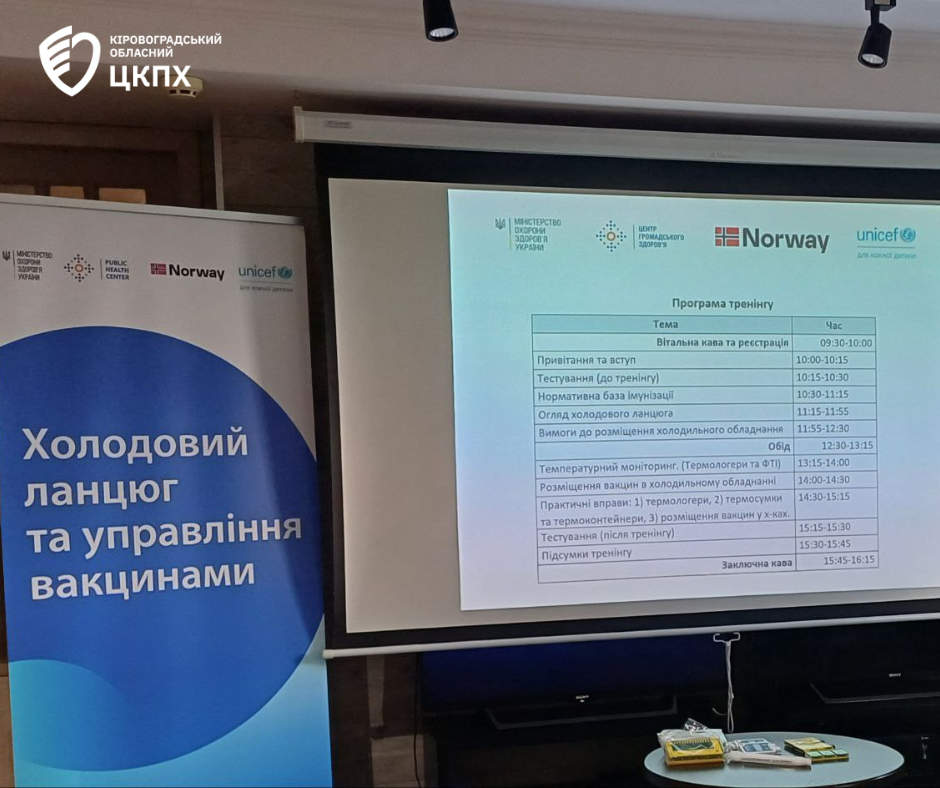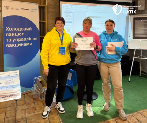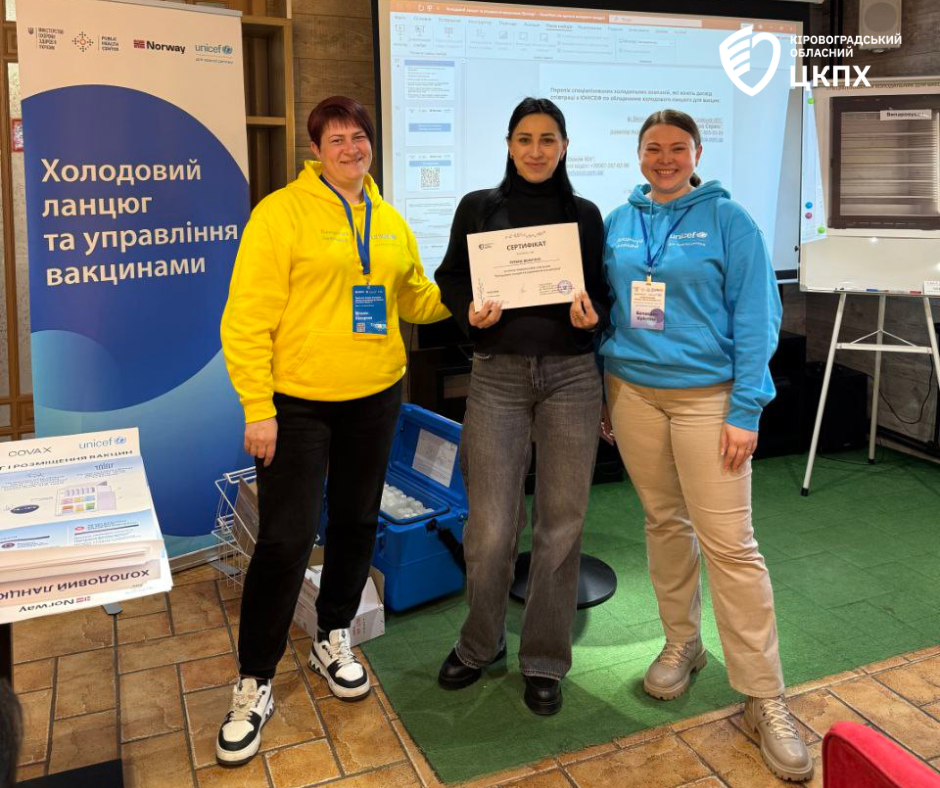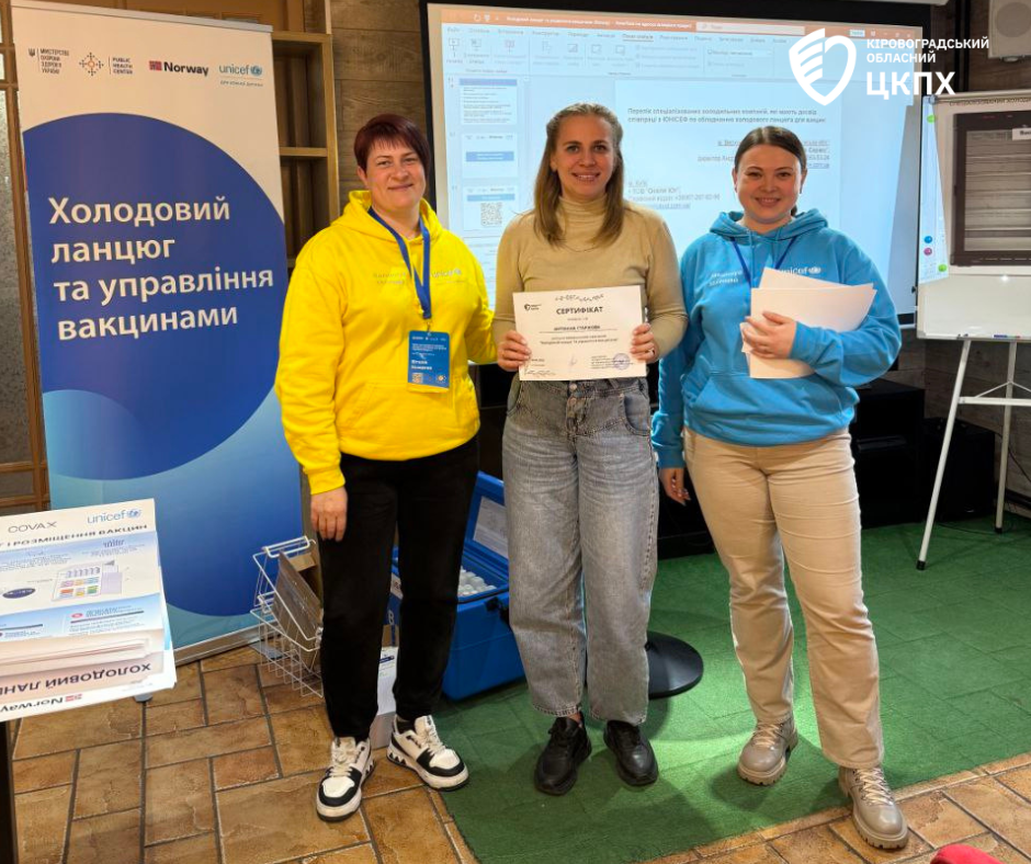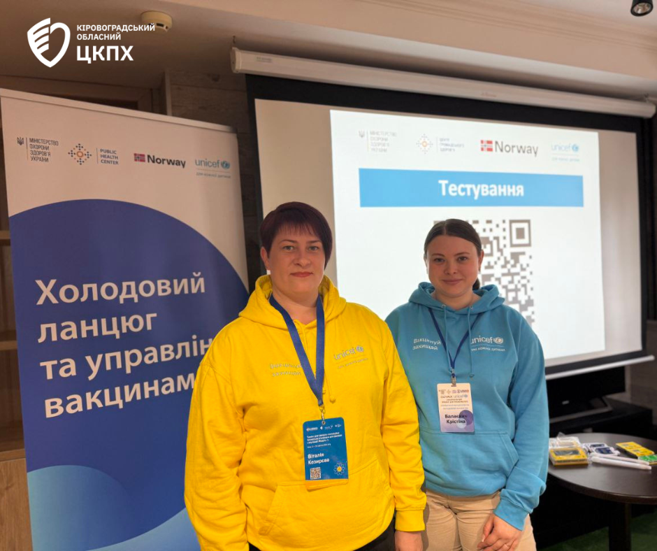Лікарки-епідеміологині відділу імунопрофілактики Центру контролю та профілактики хвороб Кіровоградської області Крістіна БАЛАЄВИЧ та Віталія КОЗИРЄВА успішно провели серію навчальних тренінгів «Холодовий ланцюг та управління вакцинами», організованих Дитячим фондом ООН (ЮНІСЕФ) за підтримки уряду Норвегії.