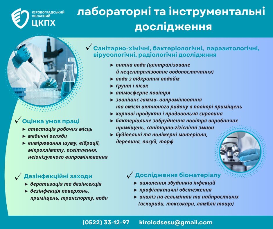 – дослідження біоматеріалу людей та об’єктів навколишнього середовища щодо виявлення збудників інфекцій;
