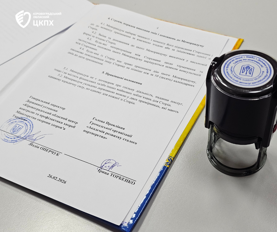 Генеральна директорка Кіровоградського обласного центру контролю та профілактики хвороб Надія Оперчук та голова правління громадської організації «Академія розвитку сталого партнерства» Ірина Торбенко підписали Меморандум про співпрацю та партнерство.