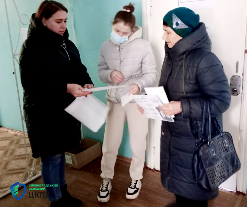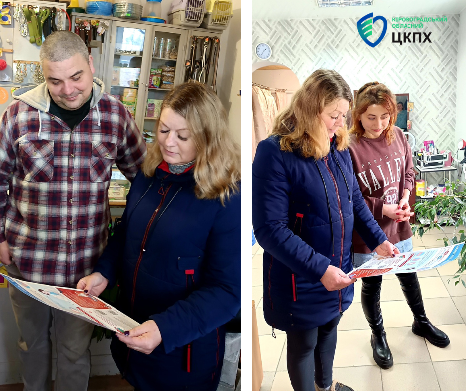 Помічниця лікаря-епідеміолога Устинівського відділення Кіровоградського обласного центру контролю та профілактики хвороб Оксана Новоженцева та фельдшер-лаборант Тетяна Кіян провели бесіди з жителями громади, пацієнтами місцевого закладу охорони здоров’я, відвідали ветеринарну аптеку та перукарню.