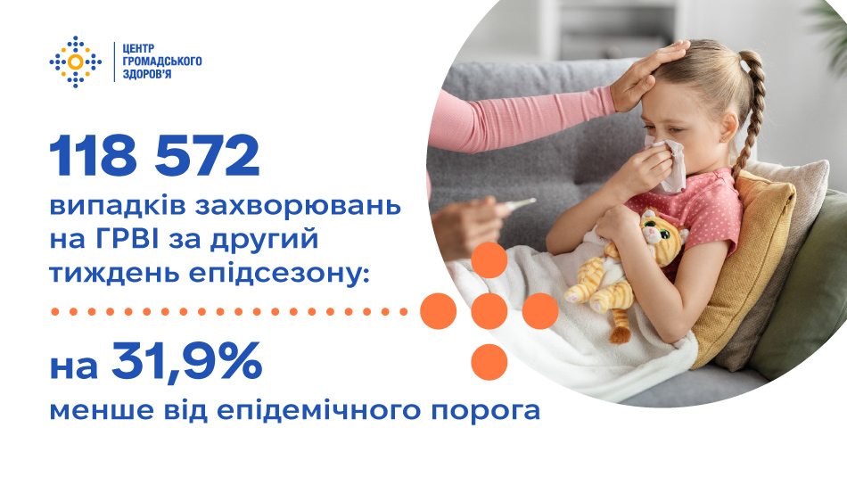 За другий тиждень епідемічного сезону захворюваності на грип та ГРВІ захворіло 118 572 особи, з них 73 396 – діти віком до 17 років. Інтенсивний показник захворюваності становить 329,1 на 100 000 населення.