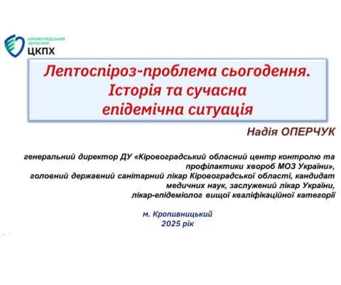 Головна державна санітарна лікарка області Надія Оперчук разом із фахівцями Кіровоградського обласного центру контролю та профілактики хвороб організували та провели захід із безперервного професійного розвитку на тему: «Лептоспіроз. Сучасна епідемічна ситуація, клінічні прояви, лабораторна діагностика, основи епідеміології та заходи профілактики».