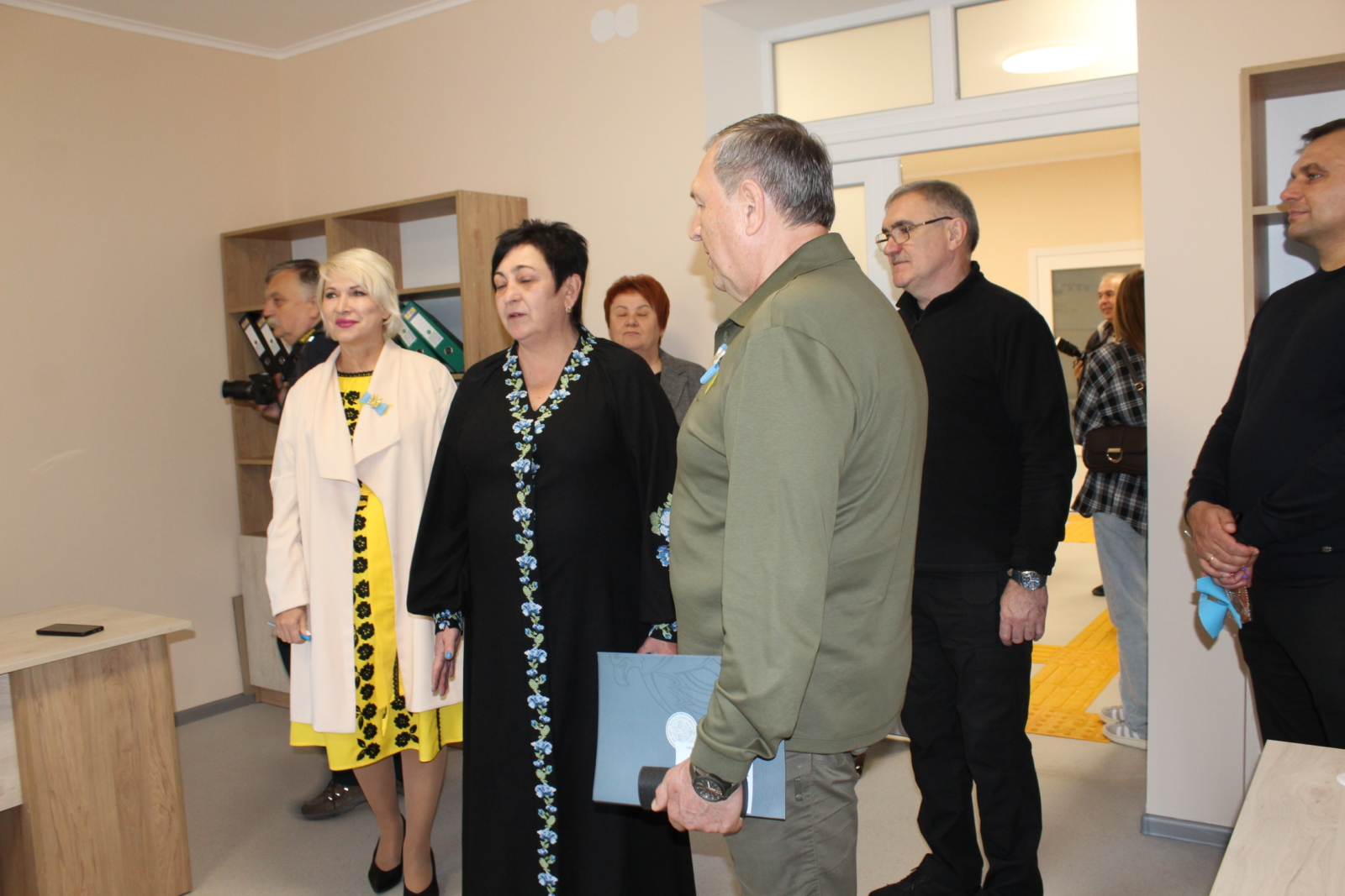 Поважні гості оглянули відремонтоване приміщення центру. Саме там втілюватимуть проєкт із запровадження комплексної соціальної послуги з формування життєстійкості. Скористатися його послугами зможе будь-який житель громади та тимчасово переселені особи.