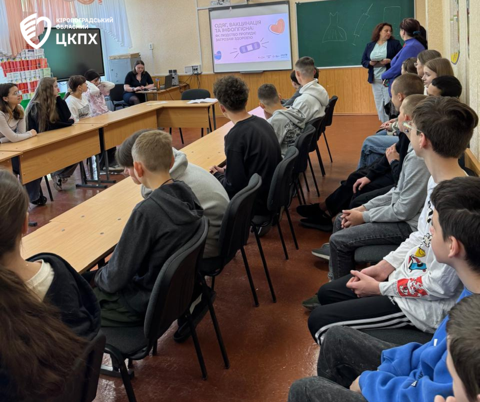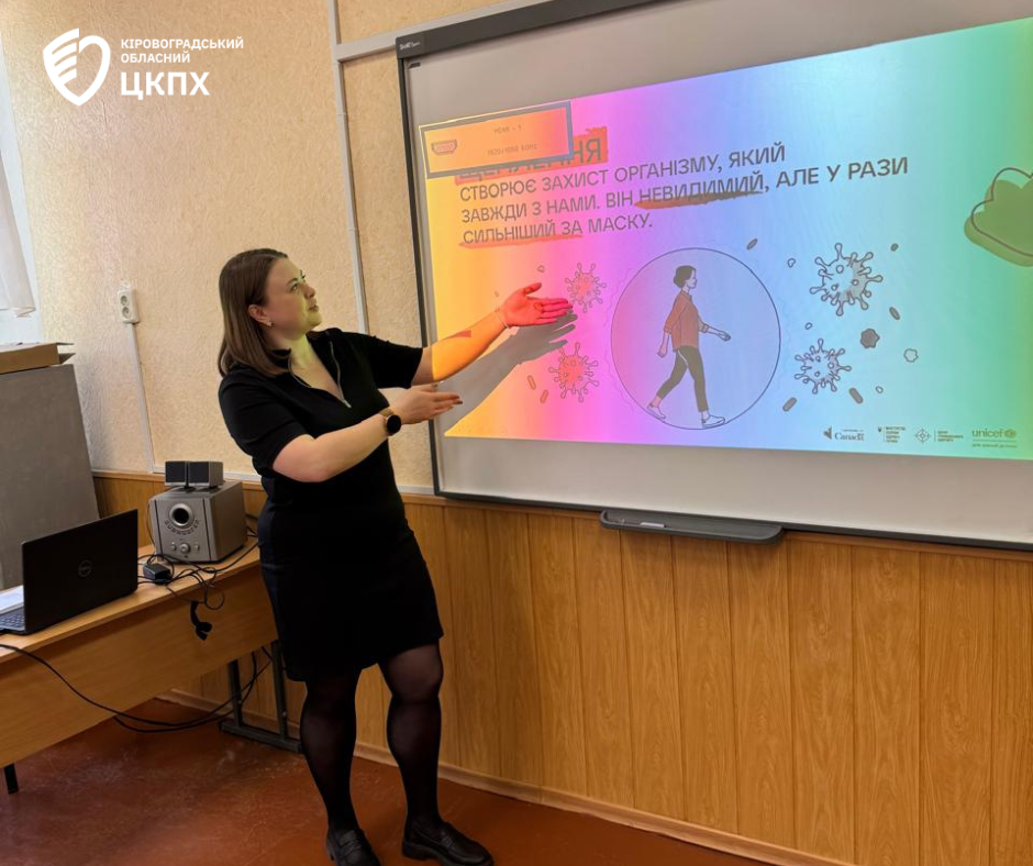 Лікарка-епідеміологиня відділу імунопрофілактики Кіровоградського обласного центру контролю та профілактики хвороб Крістіна Балаєвич в межах Всесвітнього тижня імунізації провела пізнавальний урок для учнів 7-х класів КЗ «Гімназія «Інтелект» Кропивницької міської ради». Темою заходу стала «Одяг, вакцинація та інфогігієна: як людство протидіє загрозам здоров’ю».