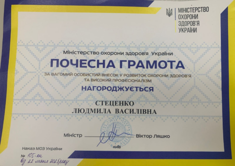 Наказом МОЗ від 22 липня 2025 року за поданням генеральної директорки ДУ КОЦКПХ Надії Оперчук за підписом міністра Віктора Ляшка у межах відзначення Дня медичного працівника завідувачку Онуфріївського відділення Центру Людмилу Стеценко нагородили відомчою Почесною грамотою.