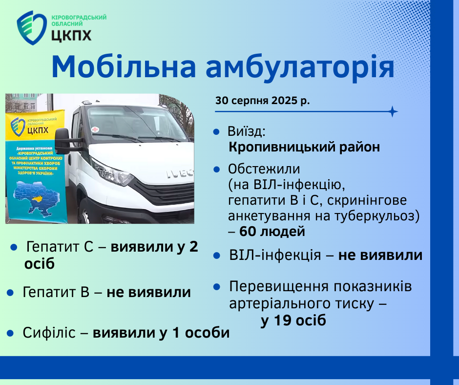Мобільна амбулаторія ДУ «Кіровоградський обласний центр контролю та профілактики хвороб МОЗ України» продовжує надавати медичні послуги.