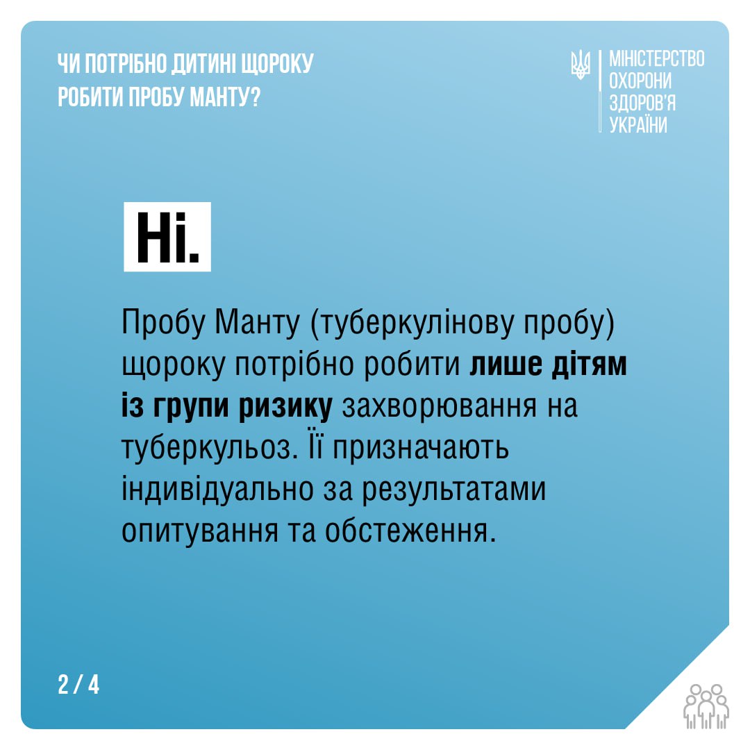 Про всяк випадок нагадуємо: проба Манту — це не щеплення. Її не потрібно робити всім дітям, і тим більше щороку.